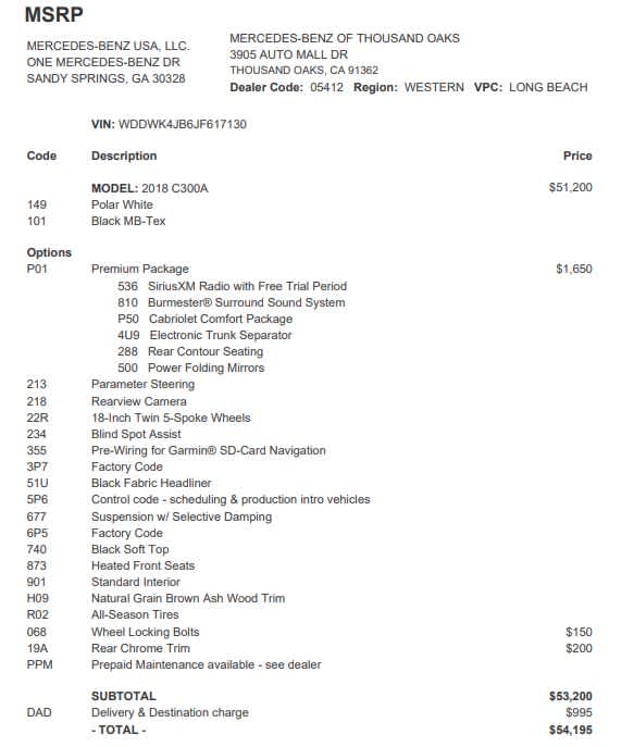 PREMIUM PACKAGE AIRCAP®, Power Folding Mirrors, Burmester® Surround Sound System, Semi-Automatic Trunk Separator, SiriusXM Satellite Radio, free trial period, Cabrio Comfort Package, Heated Driver Seat, Back-Up Camera, Turbocharged, iPod/MP3 Input, CD Player Mercedes-Benz of Thousand Oaks is your local Mercedes-Benz dealership, serving the Thousand Oaks and Los Angeles Metro area since 1982. Our showroom always includes the most current luxurious and sophisticated Mercedes-Benz models. Were only a short trip from many communities, including Malibu and Simi Valley, and our team is happy to provide sales, financing, and automotive service and repair on site.