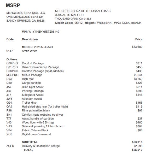HIGH ROOF, MBUX PACKAGE: Pre-Installation for Navigation, Instrument Panel Front-to-Rear Outlet, Radio: MBUX Multimedia System w/10.25 Touchscreen, Smartphone Integration Package, Acoustic Package, PARKING PACKAGE, BLIND SPOT ASSIST, SIDE WALL PANELING FULL HARDBOARD, WOOD FLOOR W/6 D-RINGS, DRIVER CONVENIENCE PACKAGE: Hinged Lid for Left & Right Storage Compartments, 2 Additional Master Keys, Electrically Folding Exterior Mirrors, Driver Seat Base 12V Power Outlet, ATTENTION ASSIST®, Hinged Lid for Storage Compartment, COMFORT PACKAGE W/SEAT ADDITION: Comfort Passengers Seat, Comfort Drivers Seat, Heated Driver Seat, Back-Up Camera, Diesel, Remote Engine Start, Heated Seats Mercedes-Benz of Thousand Oaks is your local Mercedes-Benz dealership, serving the Thousand Oaks and Los Angeles Metro area since 1982. Our showroom always includes the most current luxurious and sophisticated Mercedes-Benz models. Were only a short trip from many communities, including Malibu and Simi Valley, and our team is happy to provide sales, financing, and automotive service and repair on site.