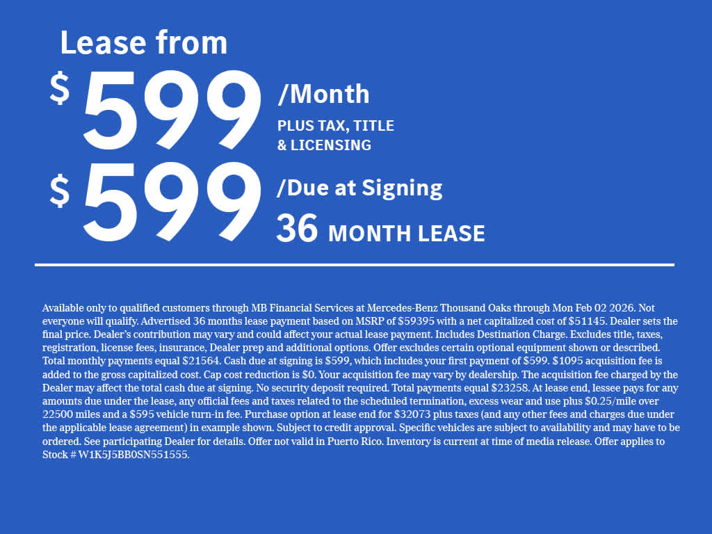 AMG® NIGHT PACKAGE PLUS chrome plated tailpipe trim in black, AMG® side sill panels w/inserts in high-gloss black, exterior mirror housing in high-gloss black, heat-insulating dark-tinted glass from the B-pillar back and Mercedes star at rear in black chrome, Night Package Plus, AMG®-Specific Radiator Grille in Black, Model and Brand Logo on Trunk in Black Chrome, Front Splitter & Trim in High-Gloss Black, high-gloss black trim on louvers and outer air intakes, WHEELS: 19 AMG® TWIN 5-SPOKE W/BLACK ACCENTS Tires: 245/35R19, High-Performance Tires, TIREFIT Mobility Kit, WHEEL LOCKING BOLTS, FIRST AID KIT, Sunroof, Panoramic Roof, Full-Time All-Wheel, Heated Driver Seat, Back-Up Camera Exchange Privilege for 7 days or 500 miles, whichever comes first, Each Certified vehicle must pass a rigorous inspection of over 165 points, 24-Hour Roadside Assistance includes trip routing, trip interruption coverage and technical help, A network of over 300 Mercedes-Benz dealers will support your Certified Mercedes-Benz, Carfax Vehicle History Report, Balance of New Car Warranty plus 1 year/unlimited miles extended Limited Warranty Mercedes-Benz of Thousand Oaks is your local Mercedes-Benz dealership, serving the Thousand Oaks and Los Angeles Metro area since 1982. Our showroom always includes the most current luxurious and sophisticated Mercedes-Benz models. Were only a short trip from many communities, including Malibu and Simi Valley, and our team is happy to provide sales, financing, and automotive service and repair on site.